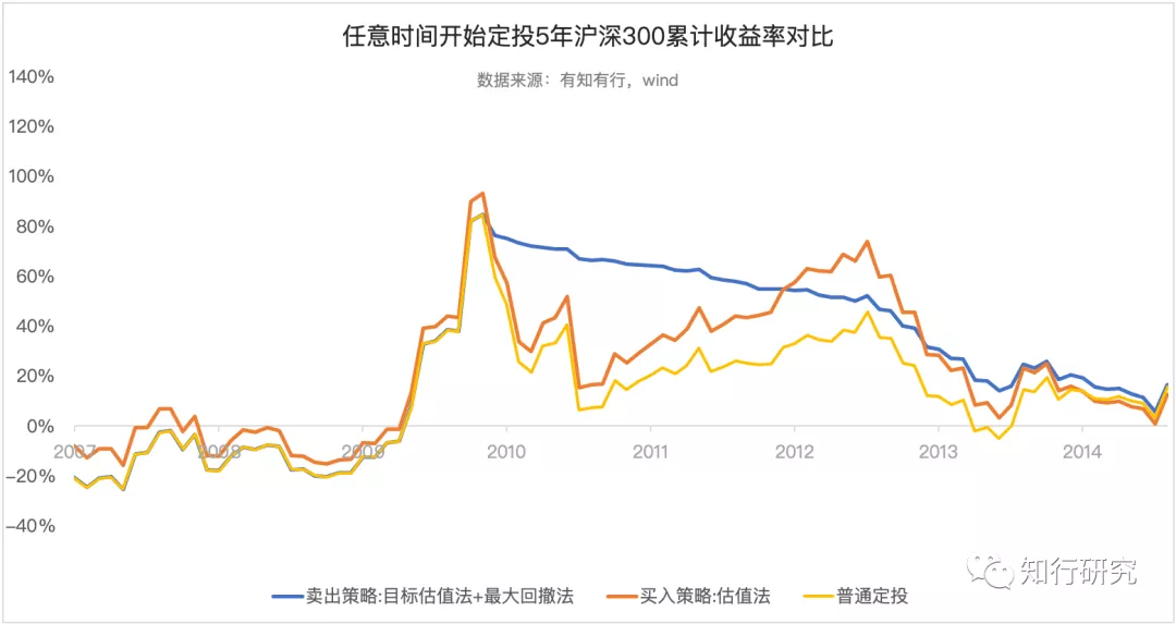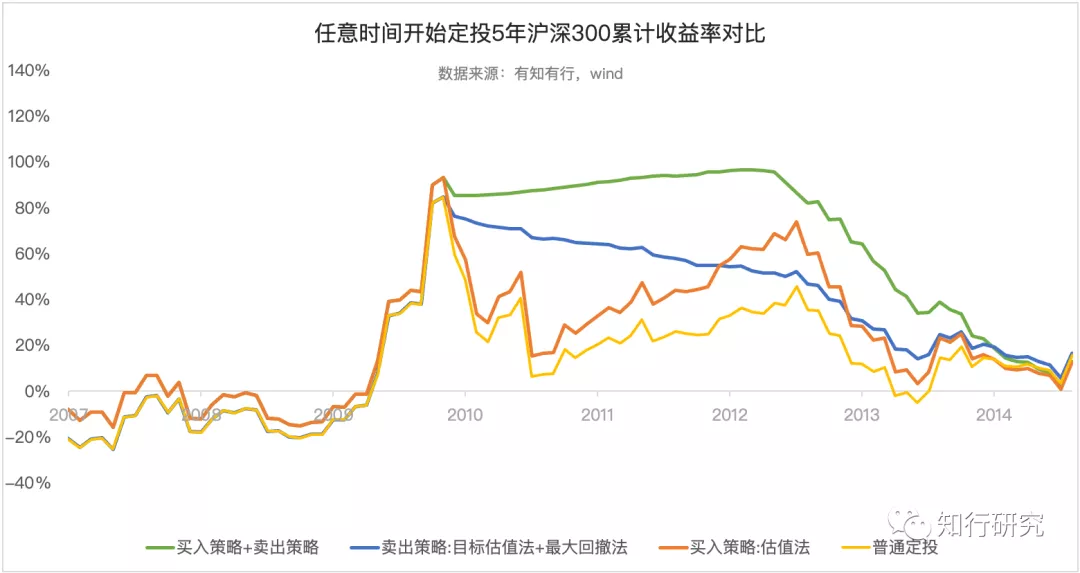 如下图所示,就是买入和卖出策略各自从不同的时间开始,定投 5 年沪深300的收益情况:
