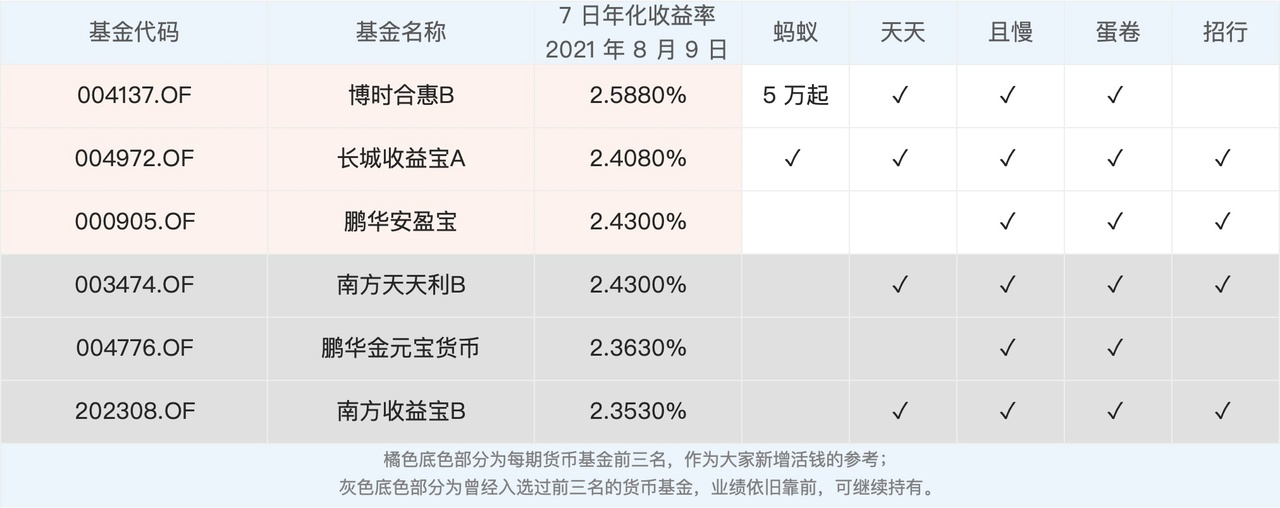 黑板报会在专栏文章中列出排名靠前的三只货币基金产品,以供参考。因为货币基金的变动情况比较小,所以不会在每一期的文章中都列出。如果一旦遇到有需要大家调换的情况,会及时告知。