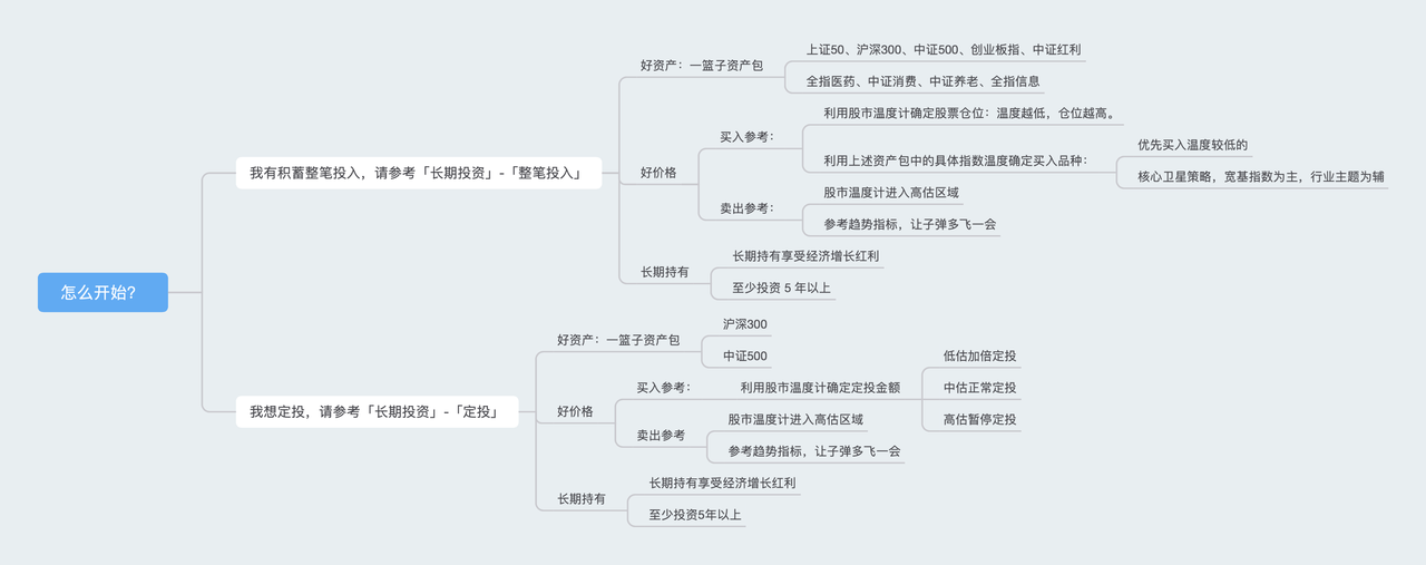 这两个投资方式在具体的实施细节上各有侧重。比如定投具有资金量小、投入频率高的特点,所以在选择好资产时,相比整笔投入来说,投资品种更少。同时,定投对择时的要求不高,所以会更看重好资产,对具体指数的温度不那么敏感。